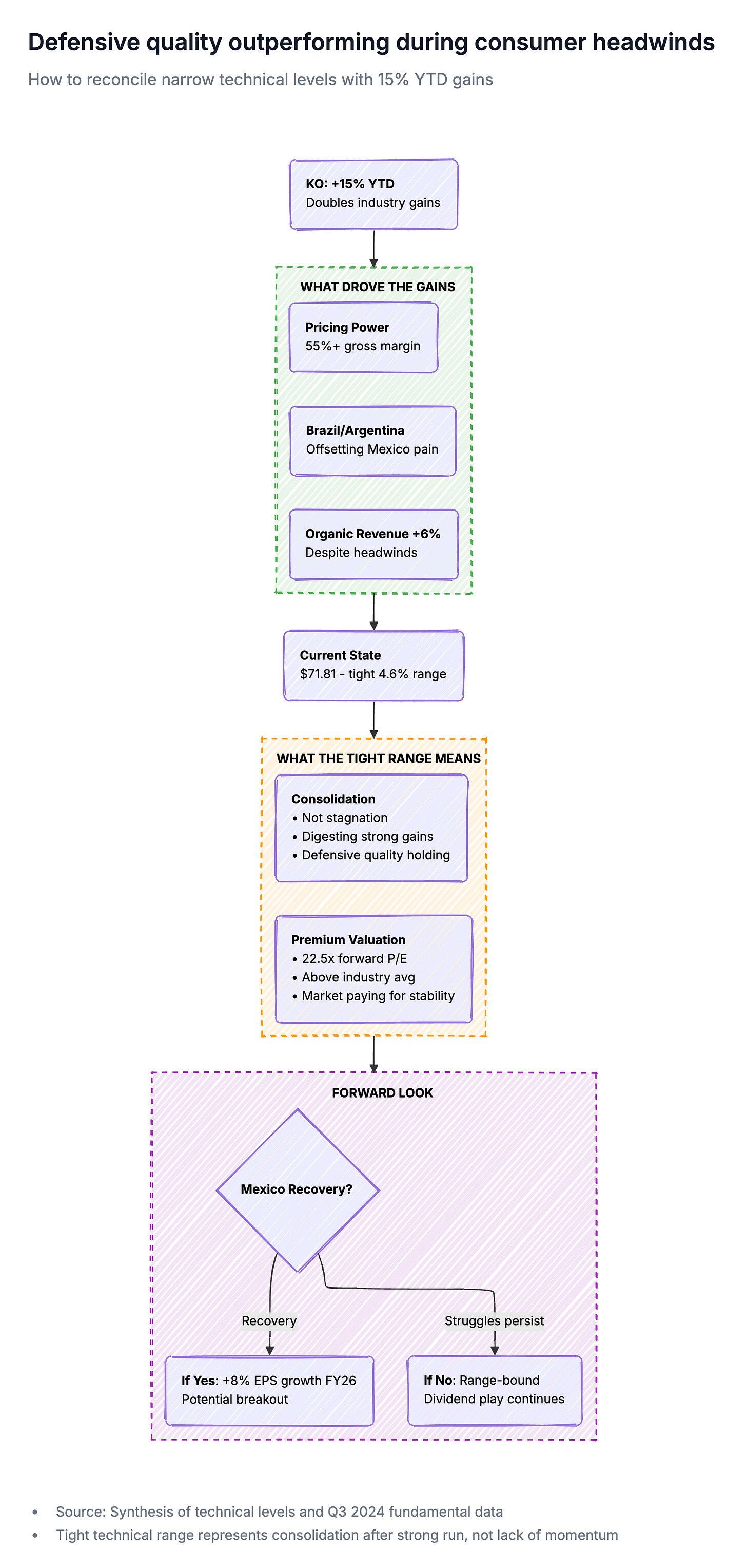 Organic revenue rose 6%, but Latin America — usually a growth engine — came in flat, dragged down by weak consumer demand in Mexico and currency pressure across the region. Shares are still up 15% YTD, outpacing peers, but momentum has clearly lost some carbonation.