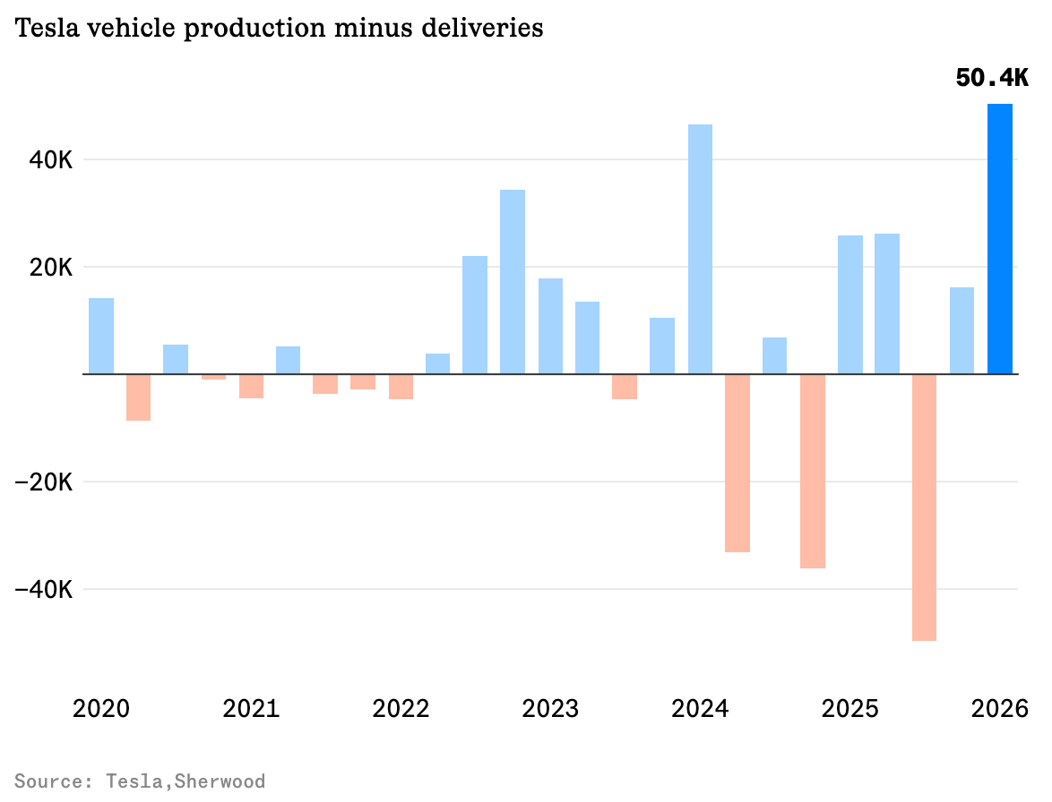 It gets worse. Tesla produced about 408,000 vehicles in the quarter, meaning it made 50,400 more cars than it sold. The largest production-to-delivery gap in the company's history. By a significant margin.
